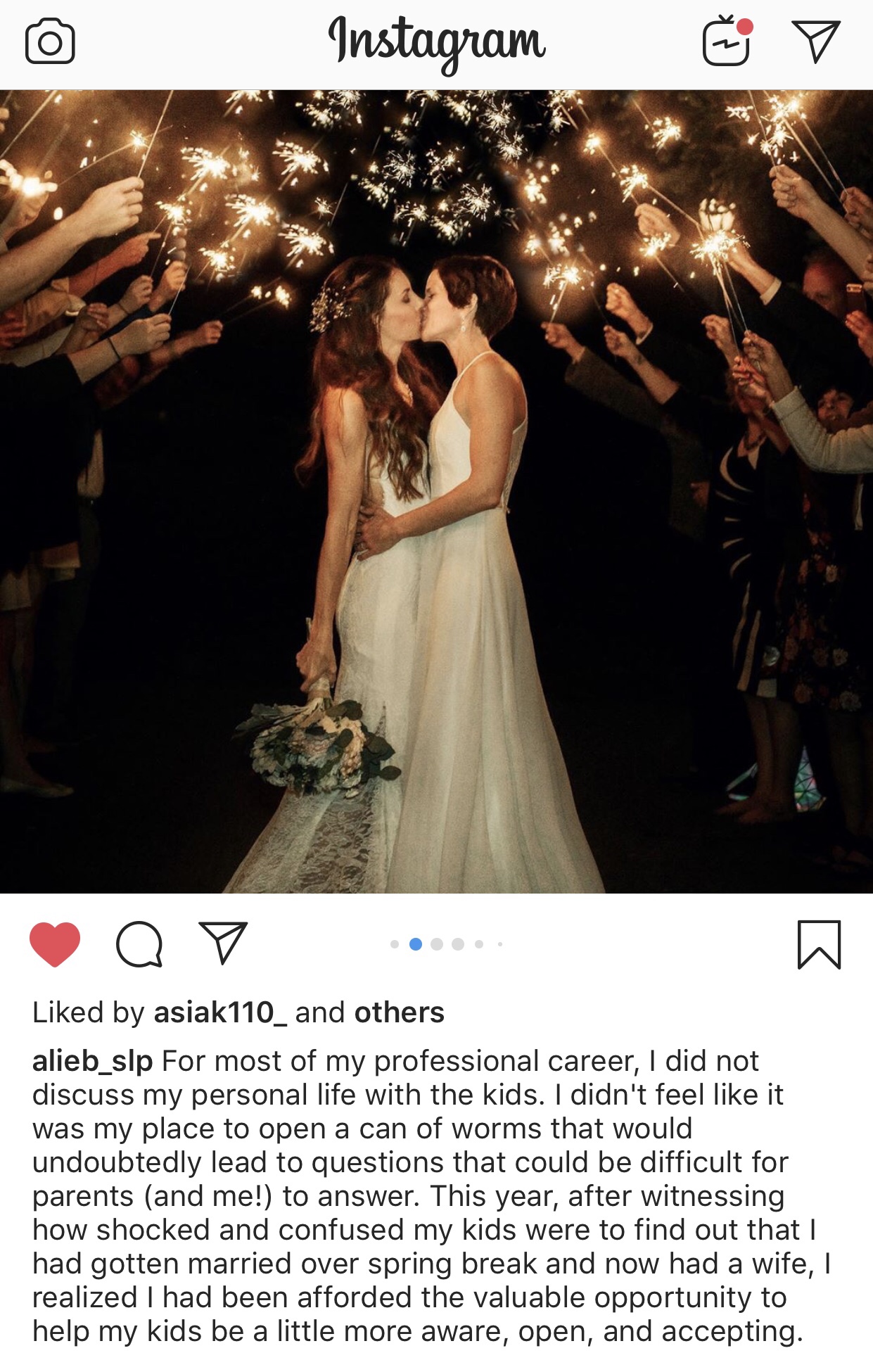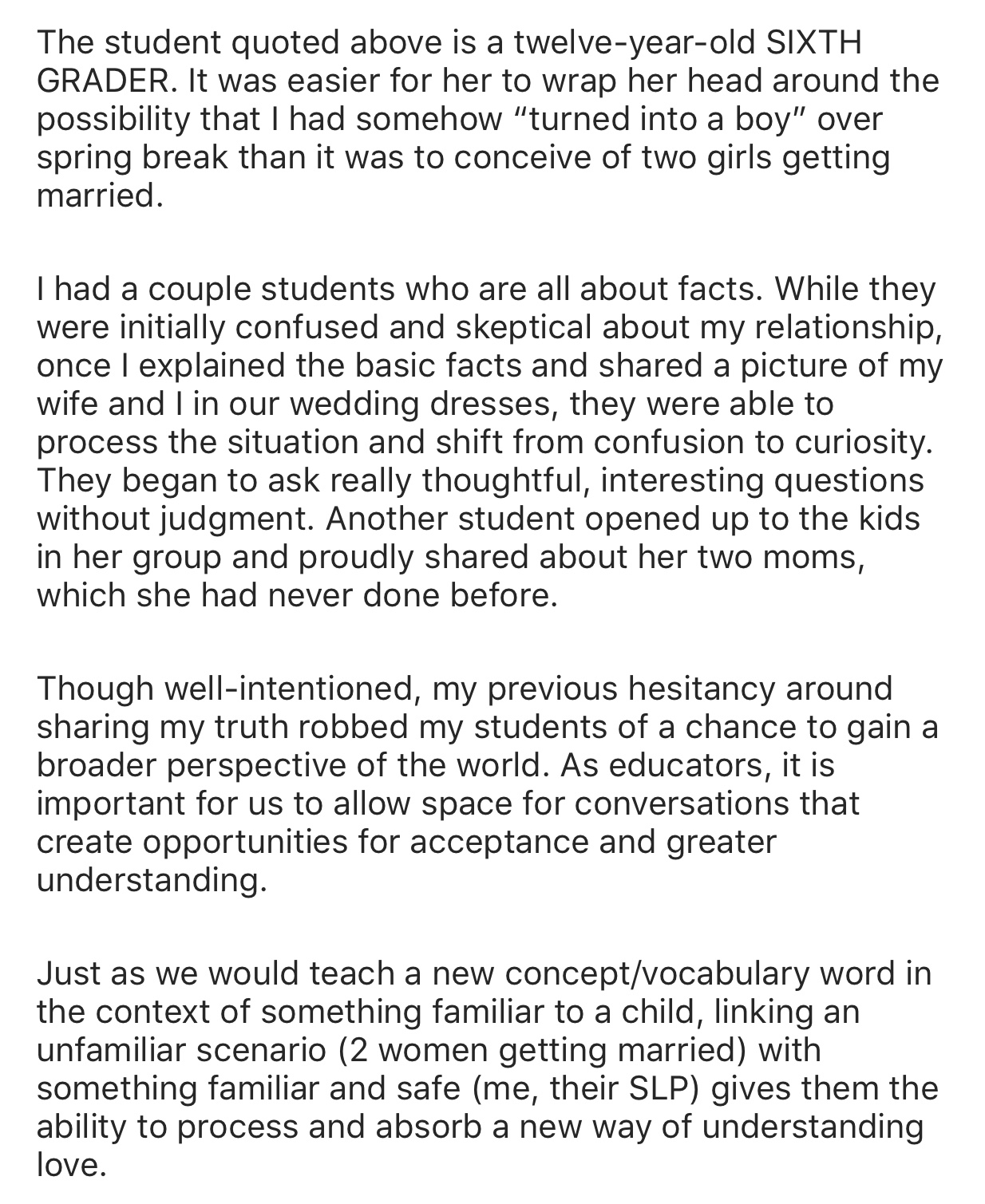Saw a lovely post from a teacher who speaks about coming out, after marrying her wife.