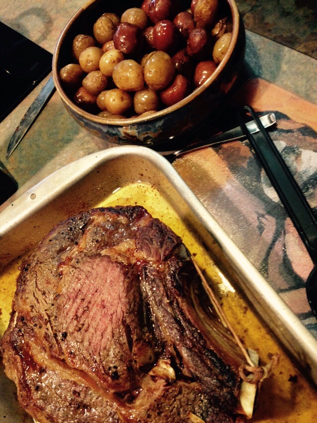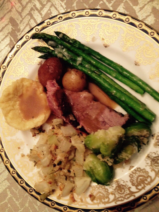 A full plate. Brussel sprouts. Asparagus. Fennel. Roast beef. Potatoes. Yorkshire pudding.