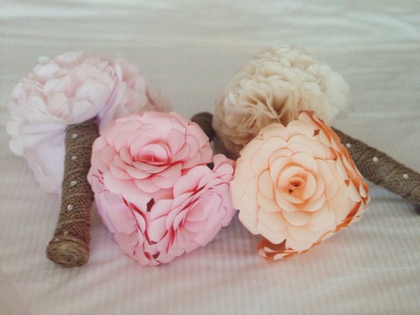 At our wedding we opted for a long-lasting, artistic and local alternative – paper flowers. Our center pieces had white hydrangeas from my mother’s garden and our bridal party carried hand-made paper bouquets, in an array of muted, complementary colours, with burlap ribbon and crystals – a perfect marriage of rough and delicate. We also love that they have lasted, and will continue to last, long past the day-of. It should also be noted that we liked the environmentally friendly aspect of forever blooms.  Our flowers were by Everblooms.  These photos were taken before the ceremony… And they look just as beautiful today as they did here.