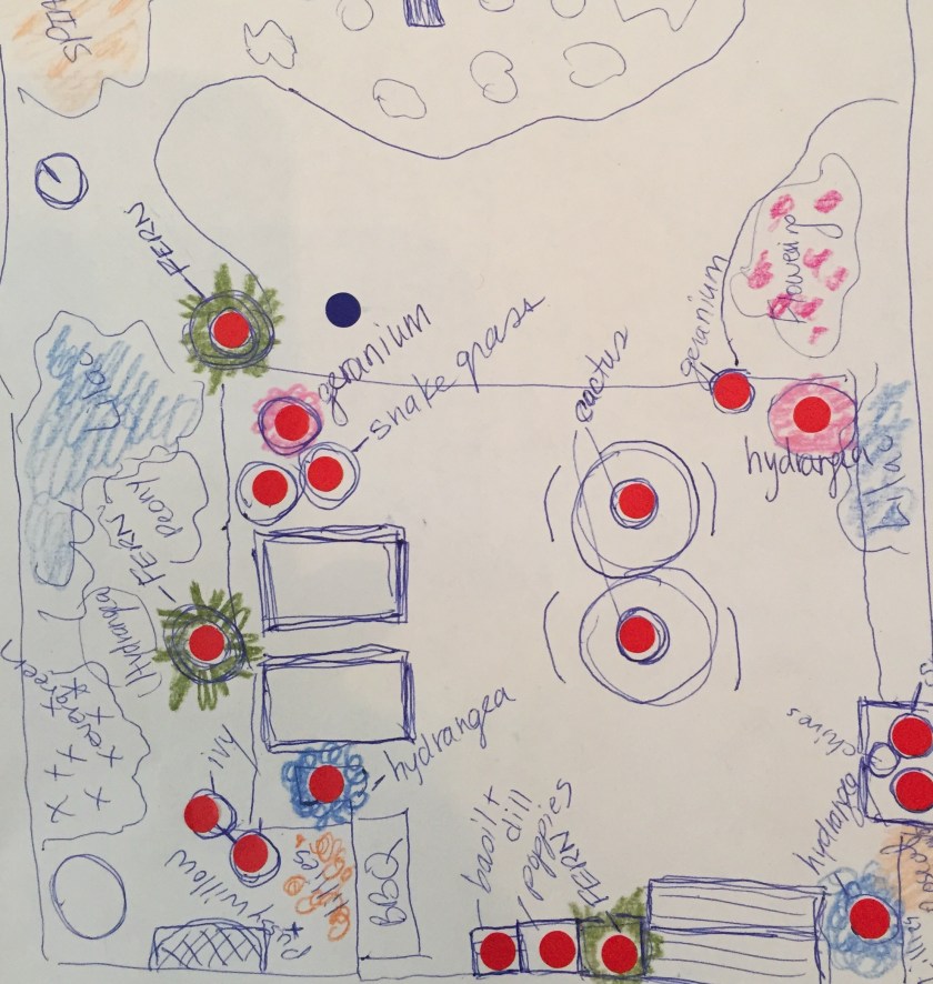 I’m excited for the chill that is absent in the spring air. I can see the grass greening up. I love a good hand-drawn aerial map of the flower beds. It’s time to reinvent, after a long winter.