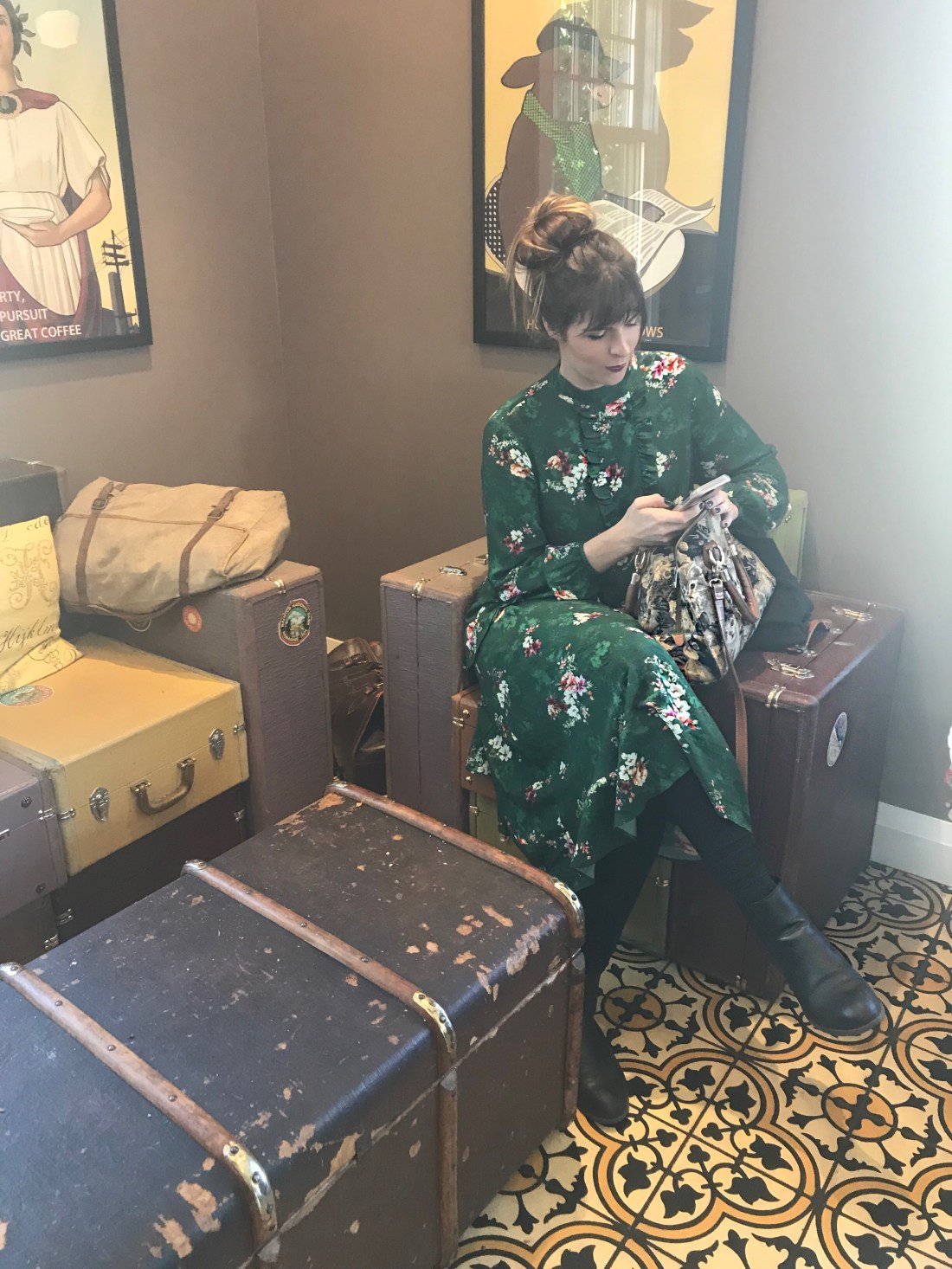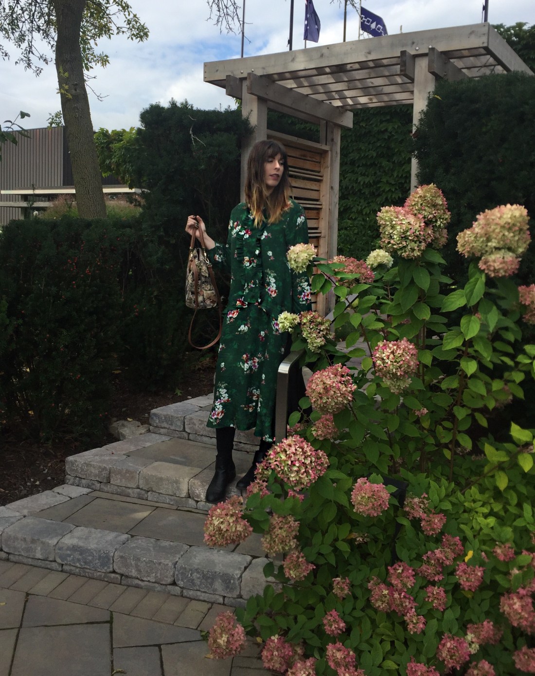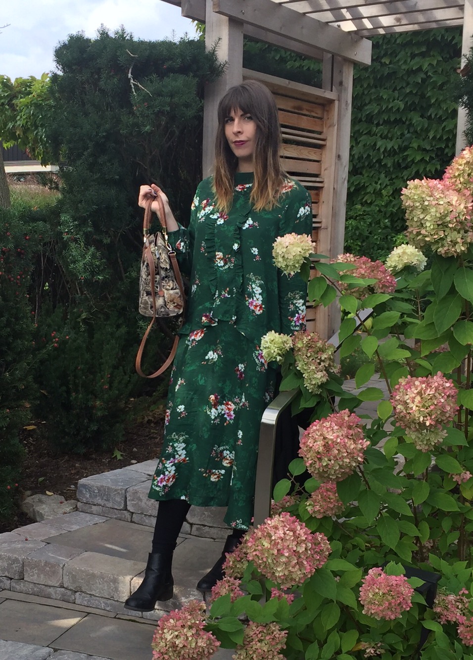 For a day of seeing live theatre and enjoying one of the year's last lunches on a patio, this green midi dress, flat black boots and cat lady bag were a perfect fit.