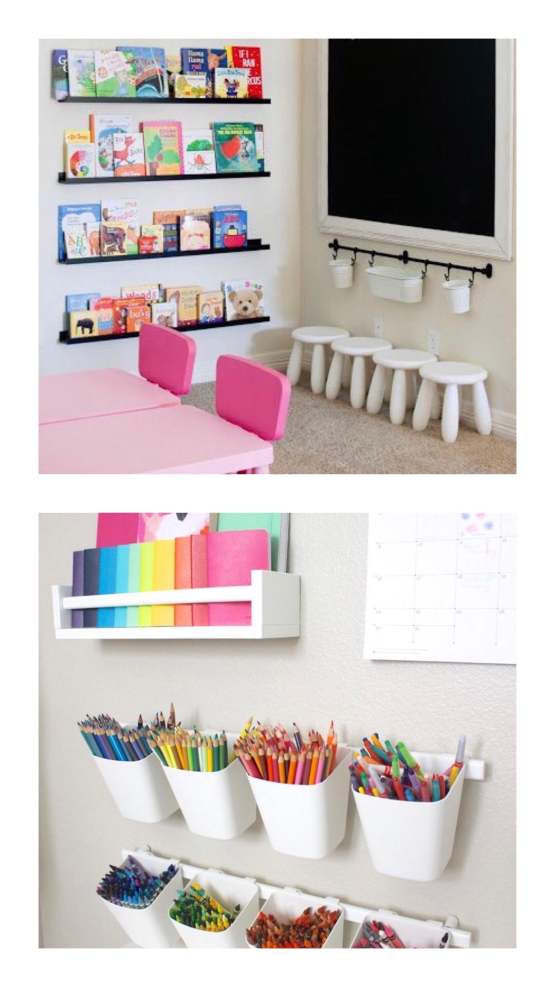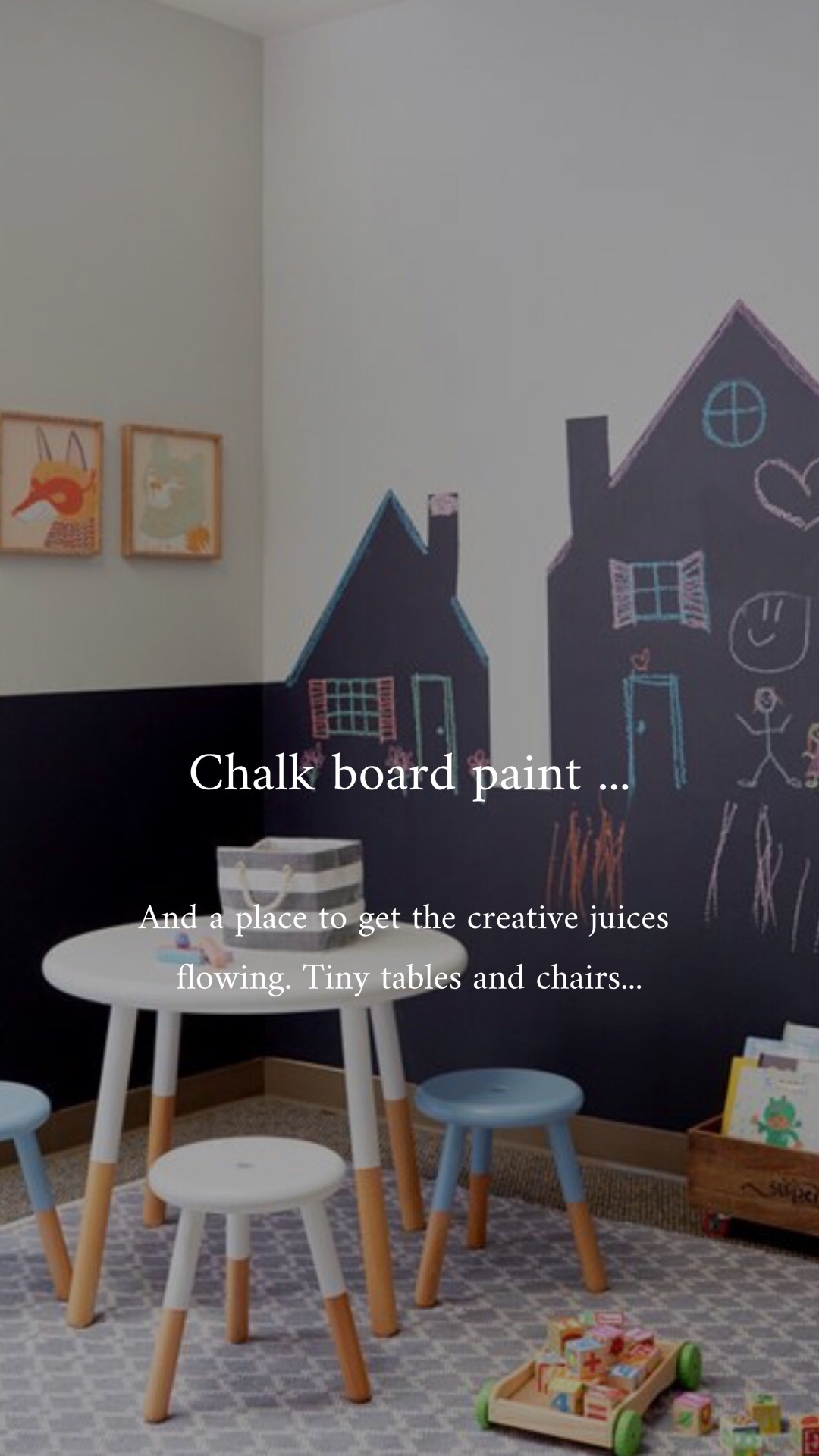 I’ve been dreaming of a makeover for our basement playroom. Book shelves, reading corners, bunting, chalk paint, soft flooring, cozy cushions, art supplies and furniture in a tiny size are all on my vision board. Here we go! all images from Pinterest, the perfect place to collect your thoughts.