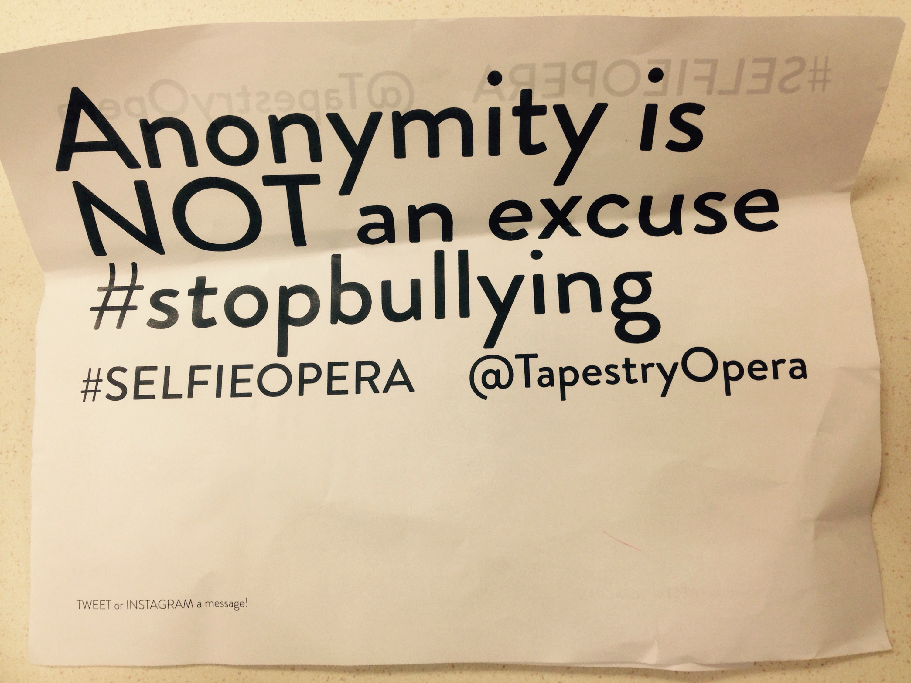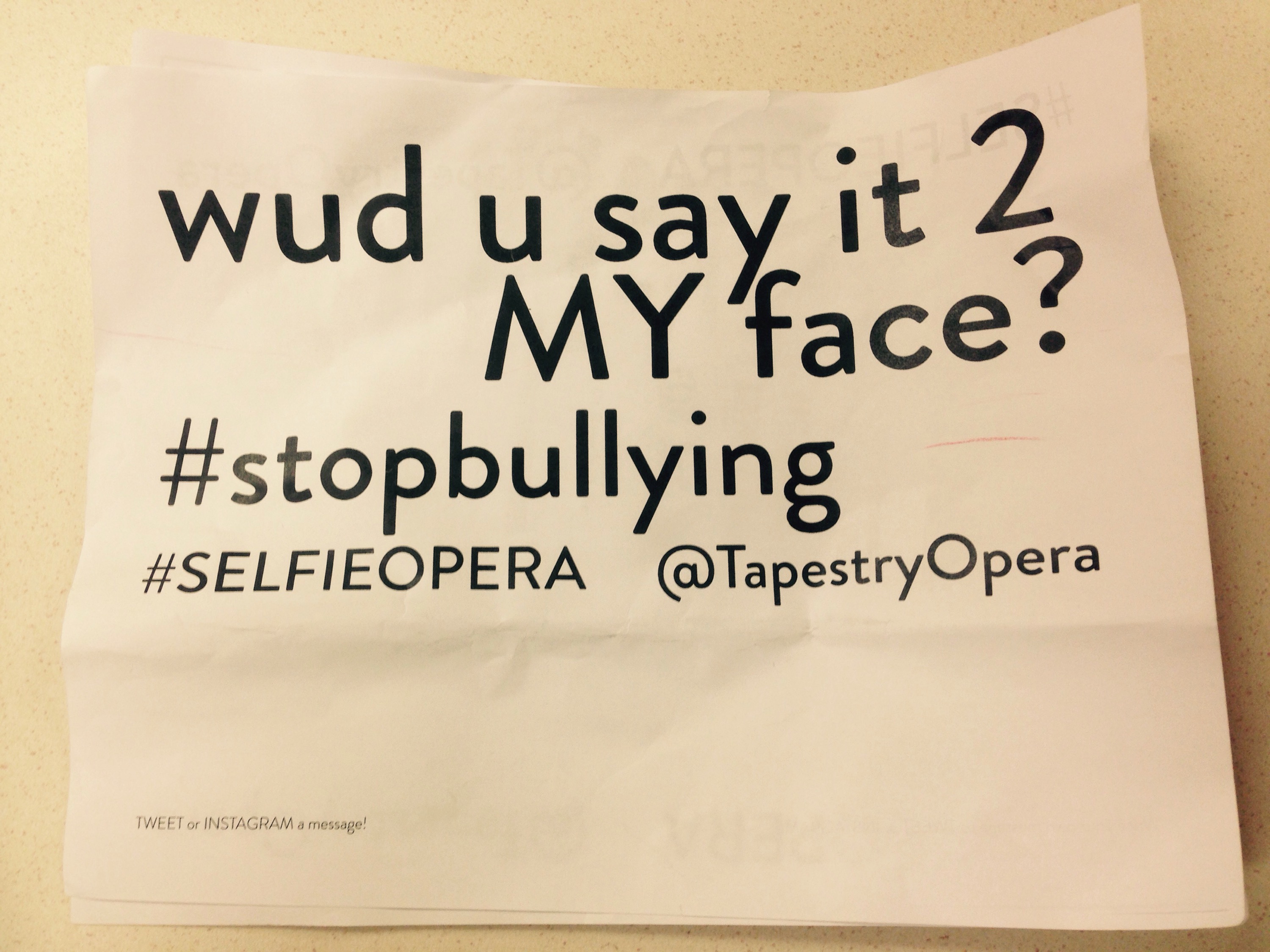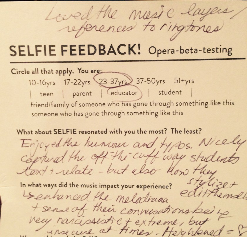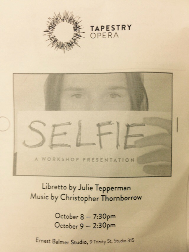 I got an invite to attend a workshop of a new Opera, Selfie. It was a witty, ironic, restrained but powerful performance, about online and text bullying. Inspired by current events that lead, ultimately, to numerous suicides, truly important issues were covered by this work in progress.