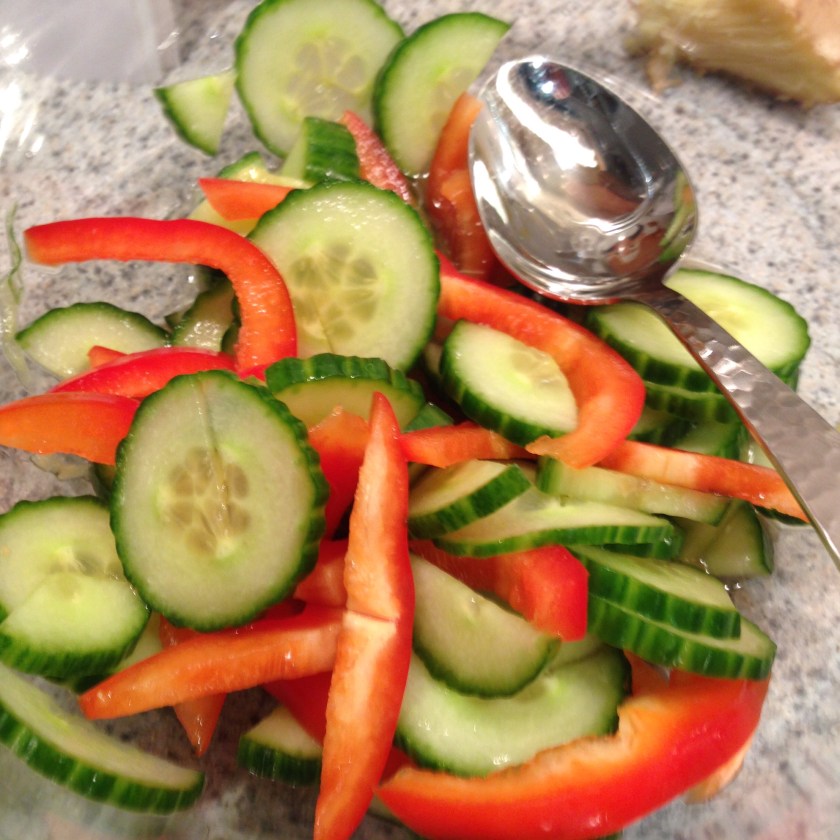 Marinate the red pepper and cucumber in the brown sugar, rice vinegar and other ingredients (see recipe).