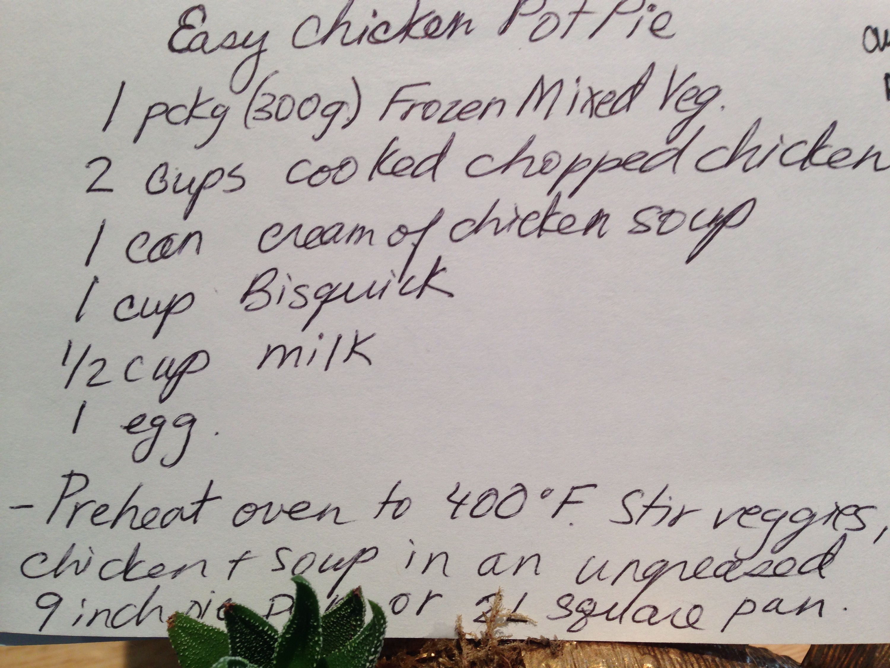 Then put the egg, milk and Bisquick in a bowl, stir it up and pour evenly over your chicken and veggie mix. Put it in the oven and … Voila!