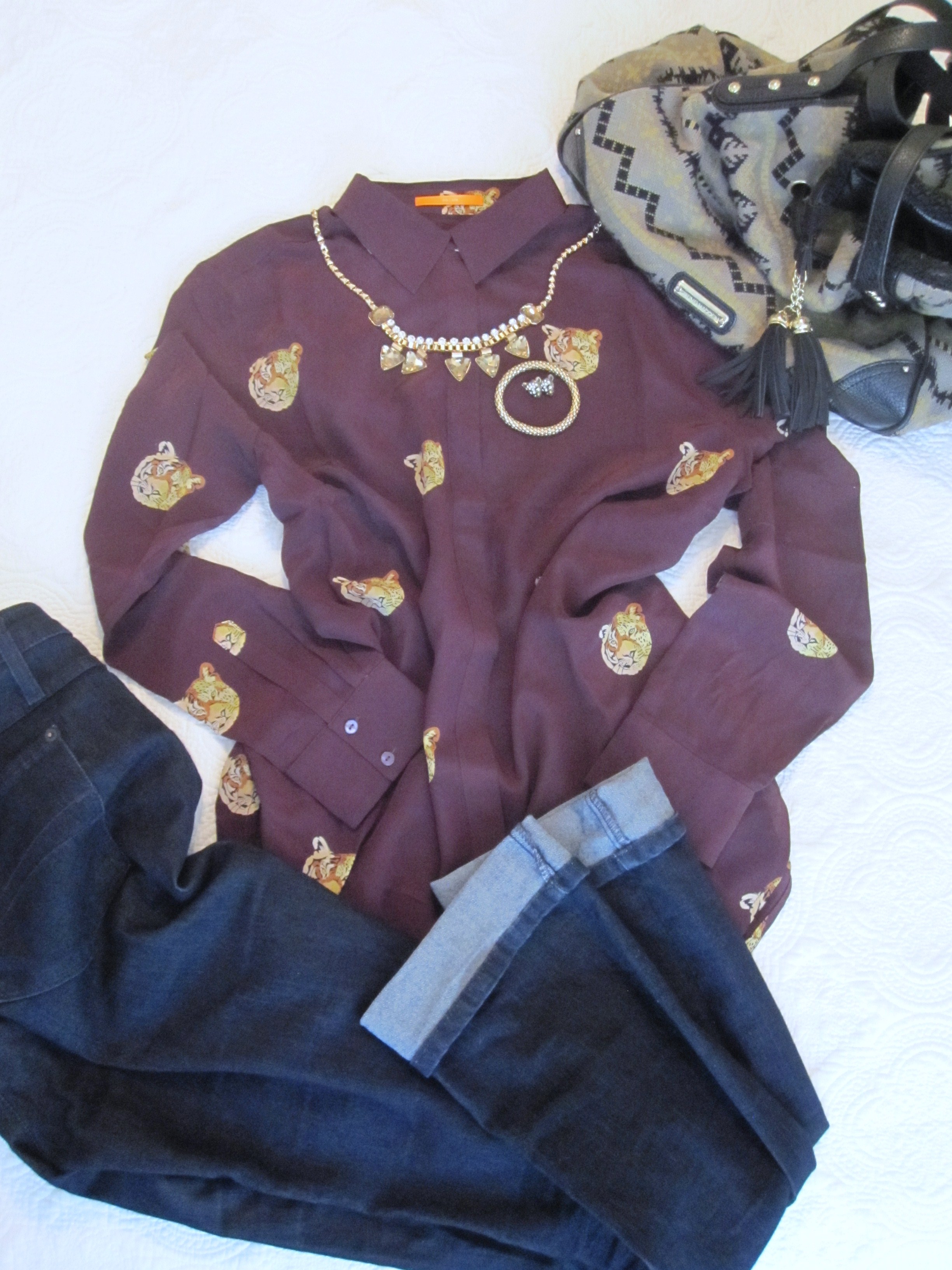 Joe Fresh sale button-up, costume jewelry and high-waisted dark denim.