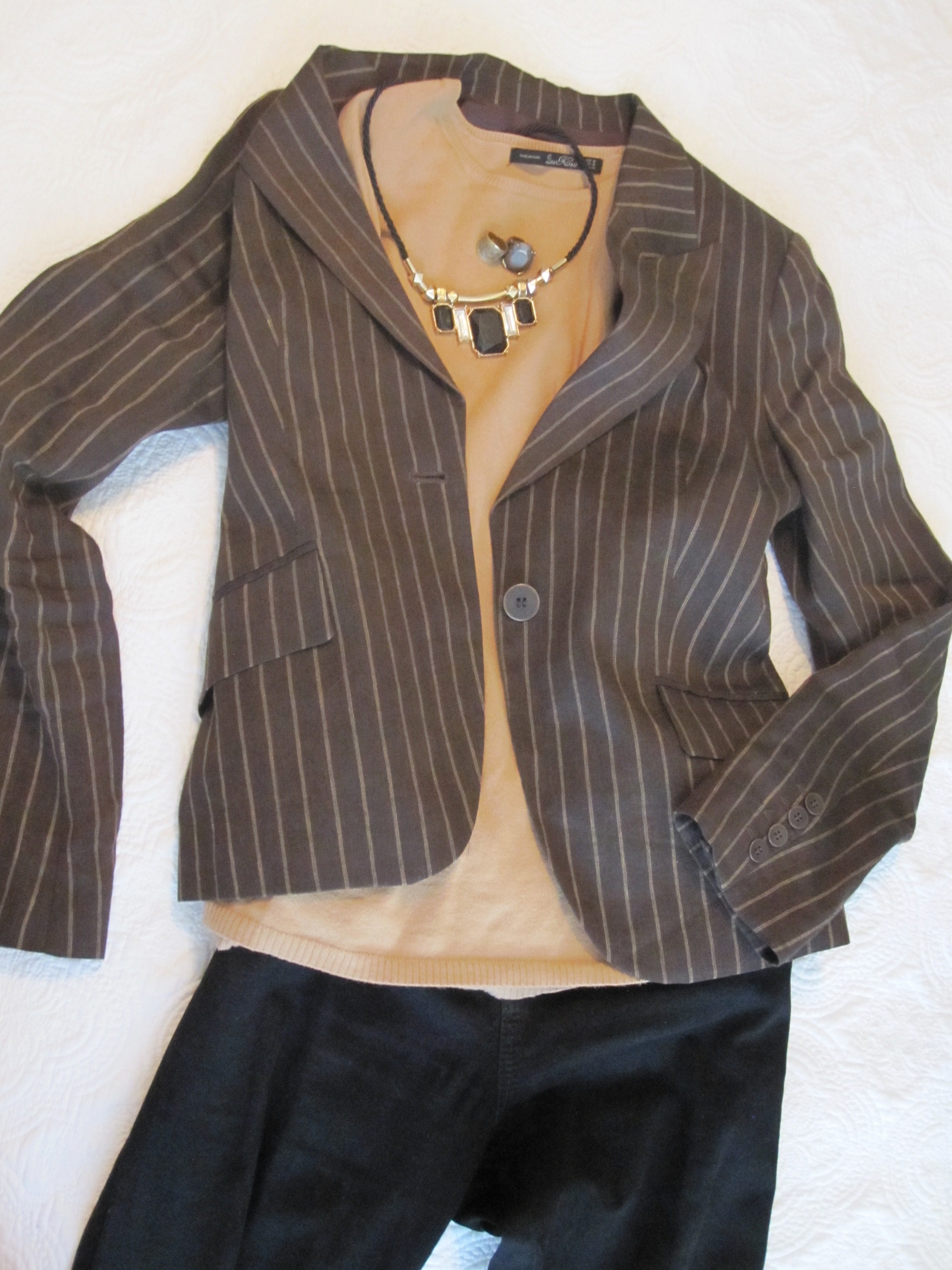 Cozy fine-knit sweater and lightweight striped blazer (both Zara), skinny black jean and statement necklace (from a garage sale of jewelry previously worn one time by television hosts), Club Monaco steel ring and hand-crafted ring from a hippie beach shop.