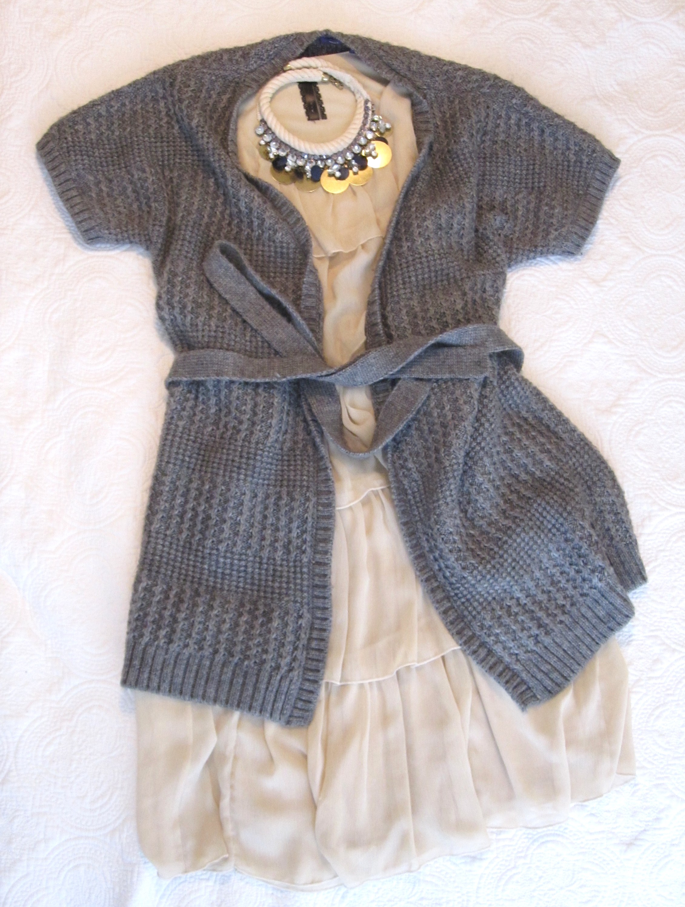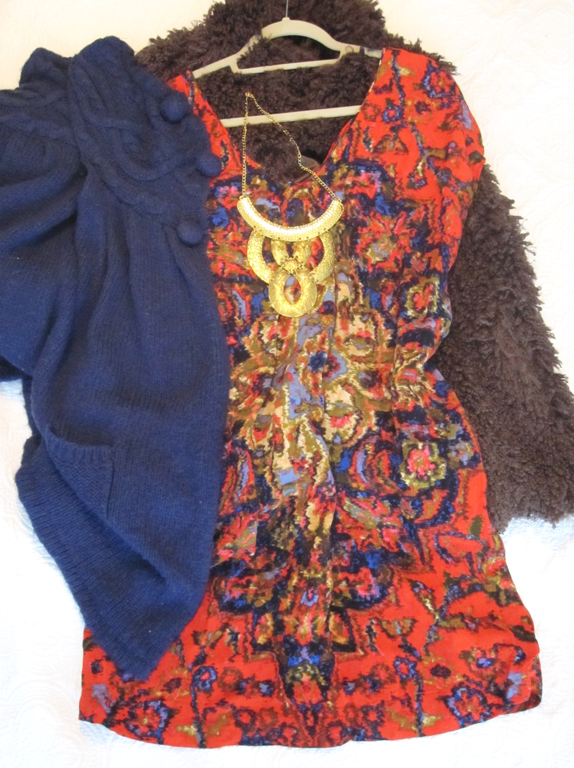 More of a splurge: wear-anywhere Anthropologie dress with ebay choker necklace and nubby long sweater, add an extra faux-sheepskin layer for drafty rooms.