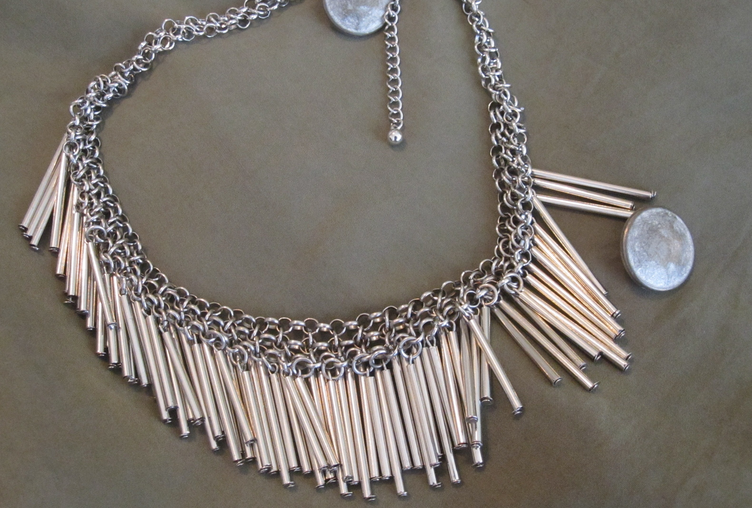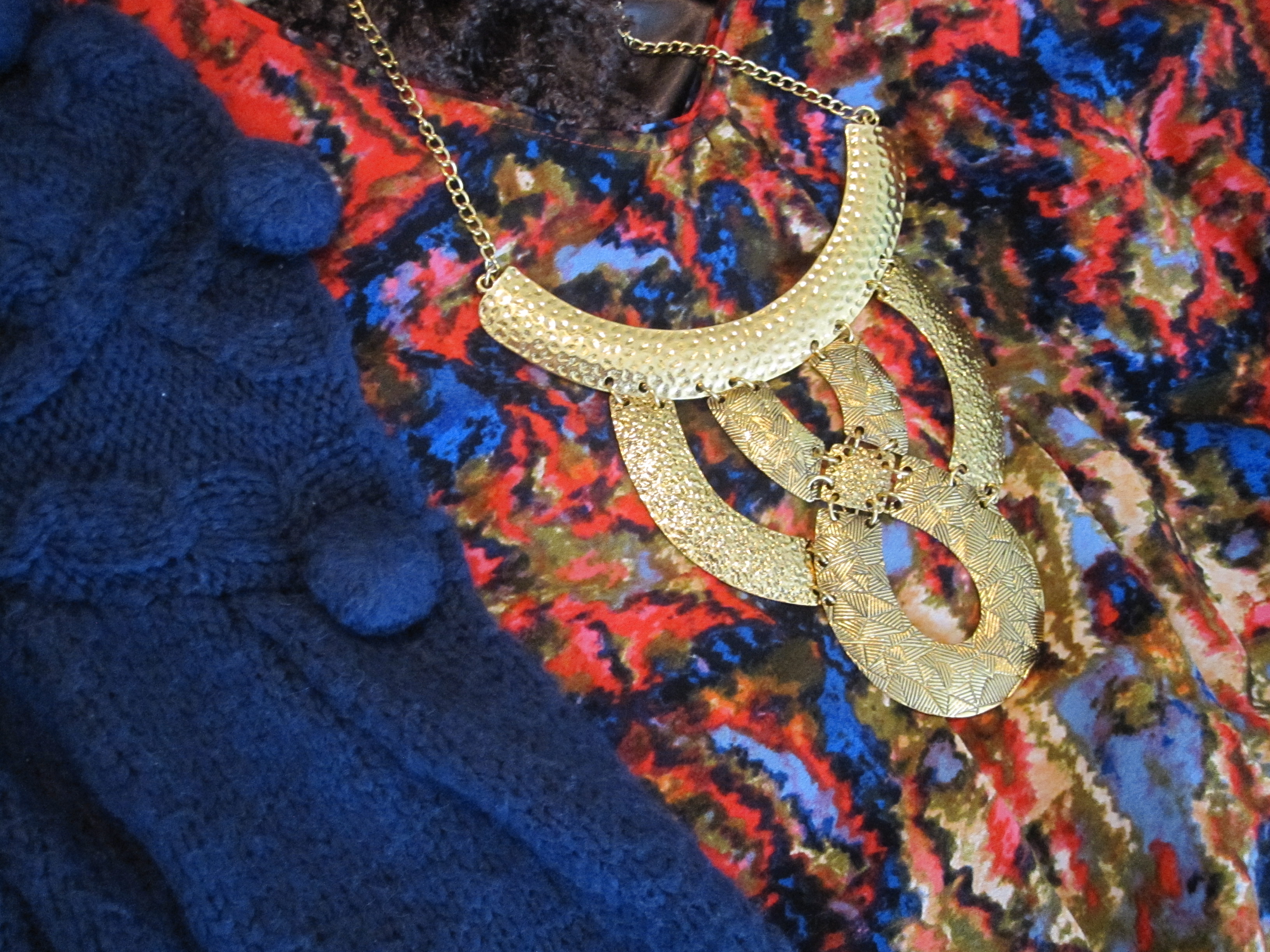 Clockwise from top left: White Feather Designs’ geometric silver and gold, Kensington Market graphic beads, E-bay $10 gold collar, 2 long pendants from YYZ Imports, H&M silver fringe, black and gold statement piece from a garage sale, Joe Fresh $5 sale baubles/rinestone necklace