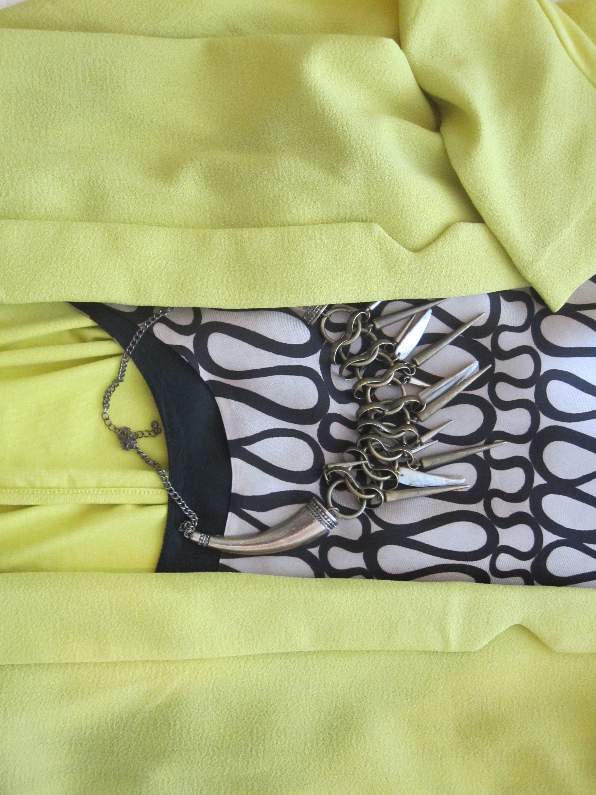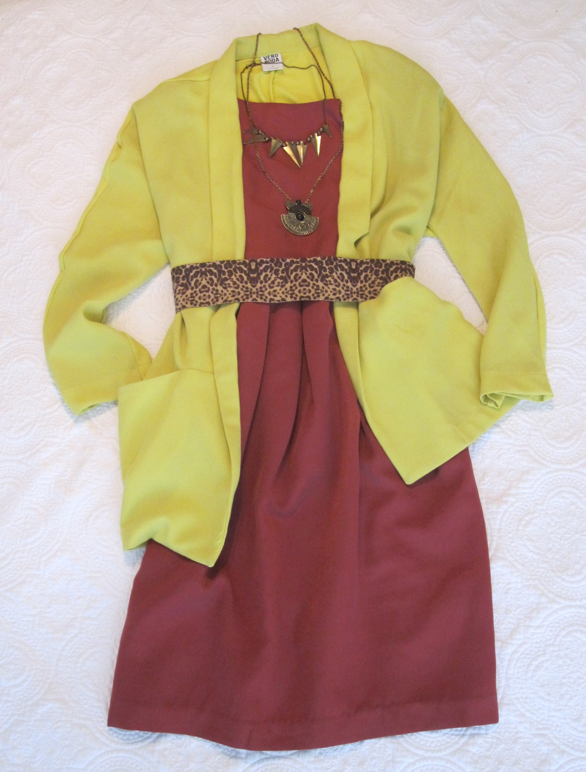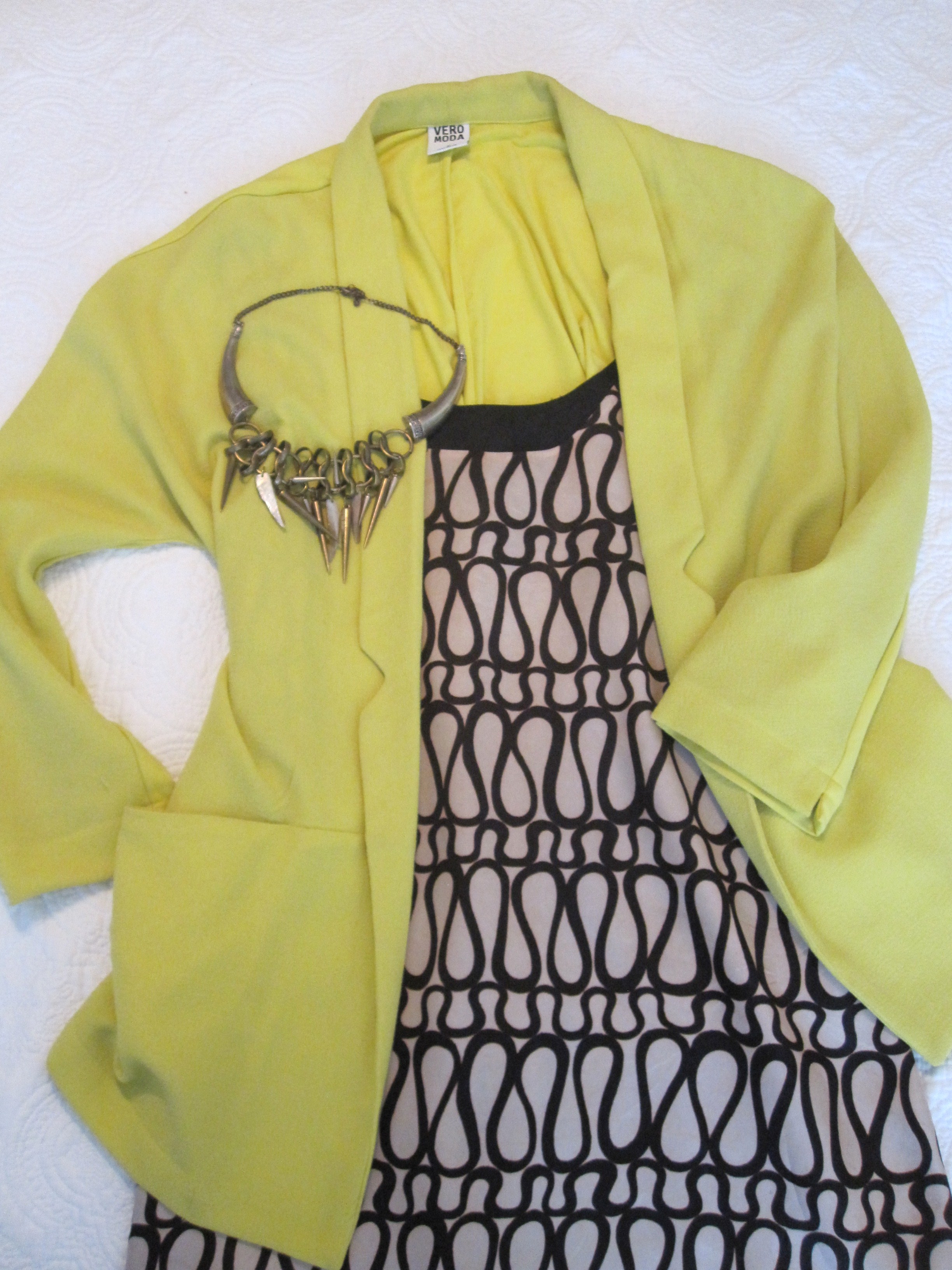 Winter brights keep me feeling happy, and chartreuse is one of my favourites. Layered to keep cozy and worn with unexpected colour combos. Vero Moda soft blazer and tunic cut from a previous theatre costume, necklace from The Bay (on sale).