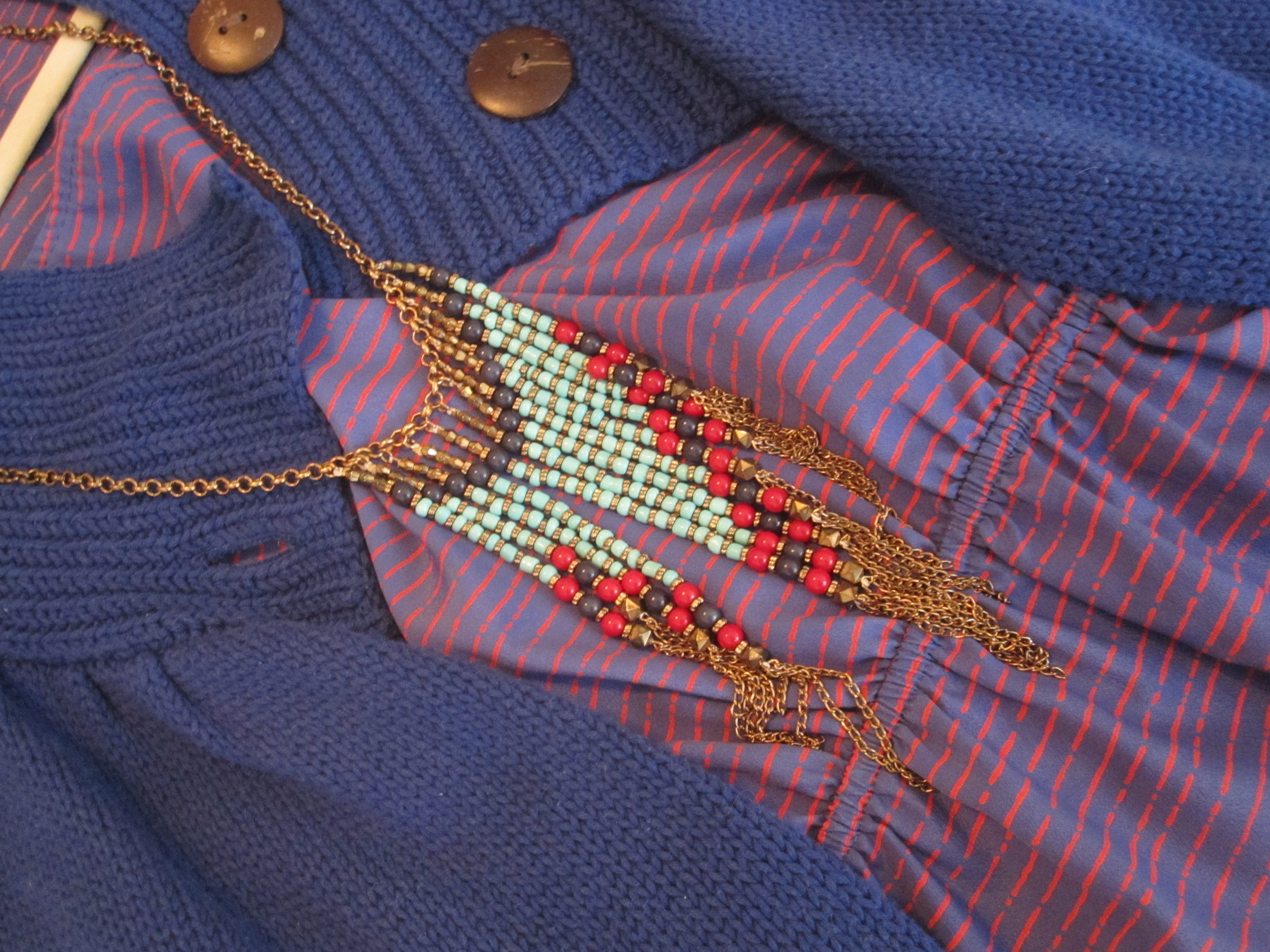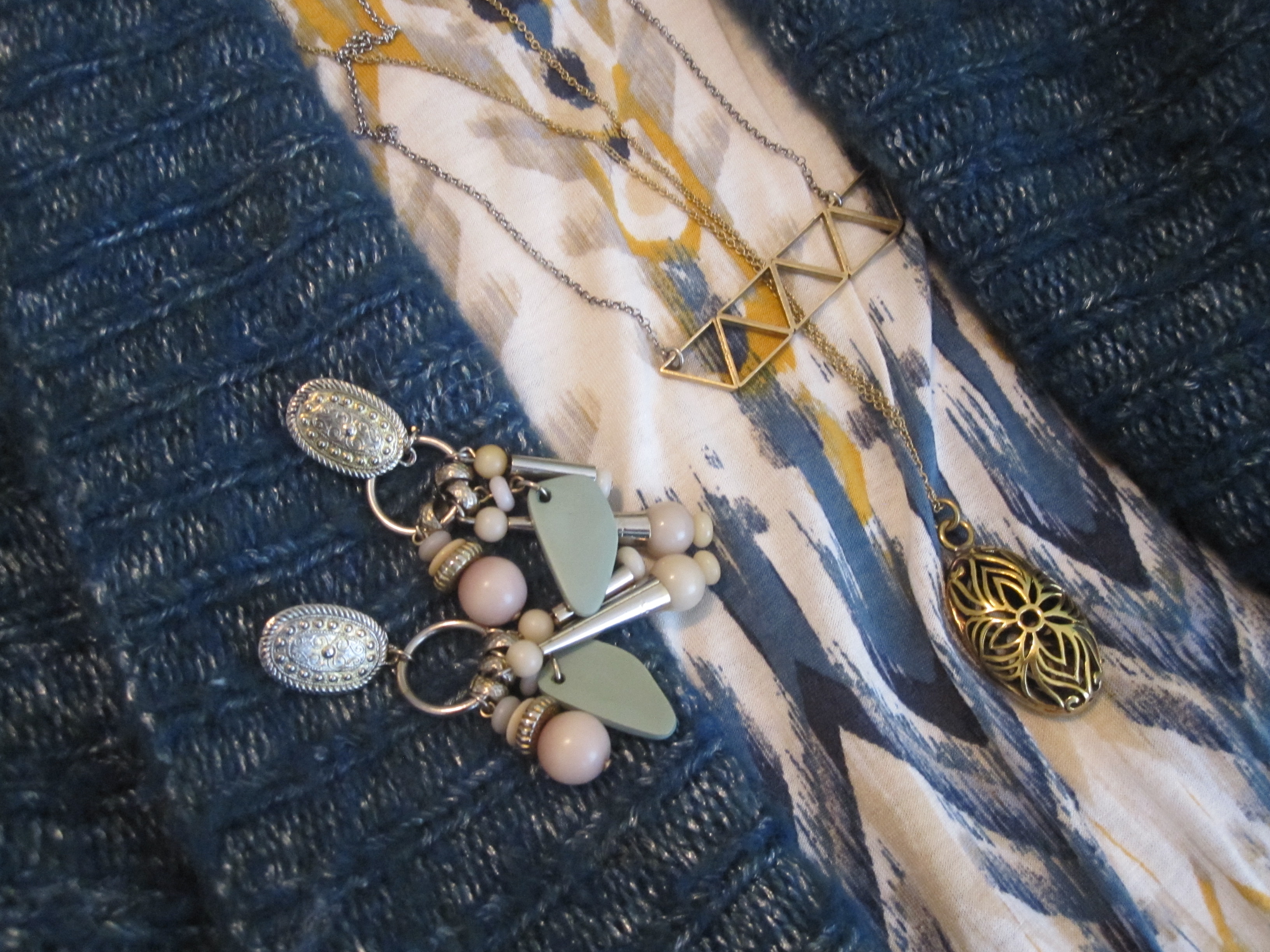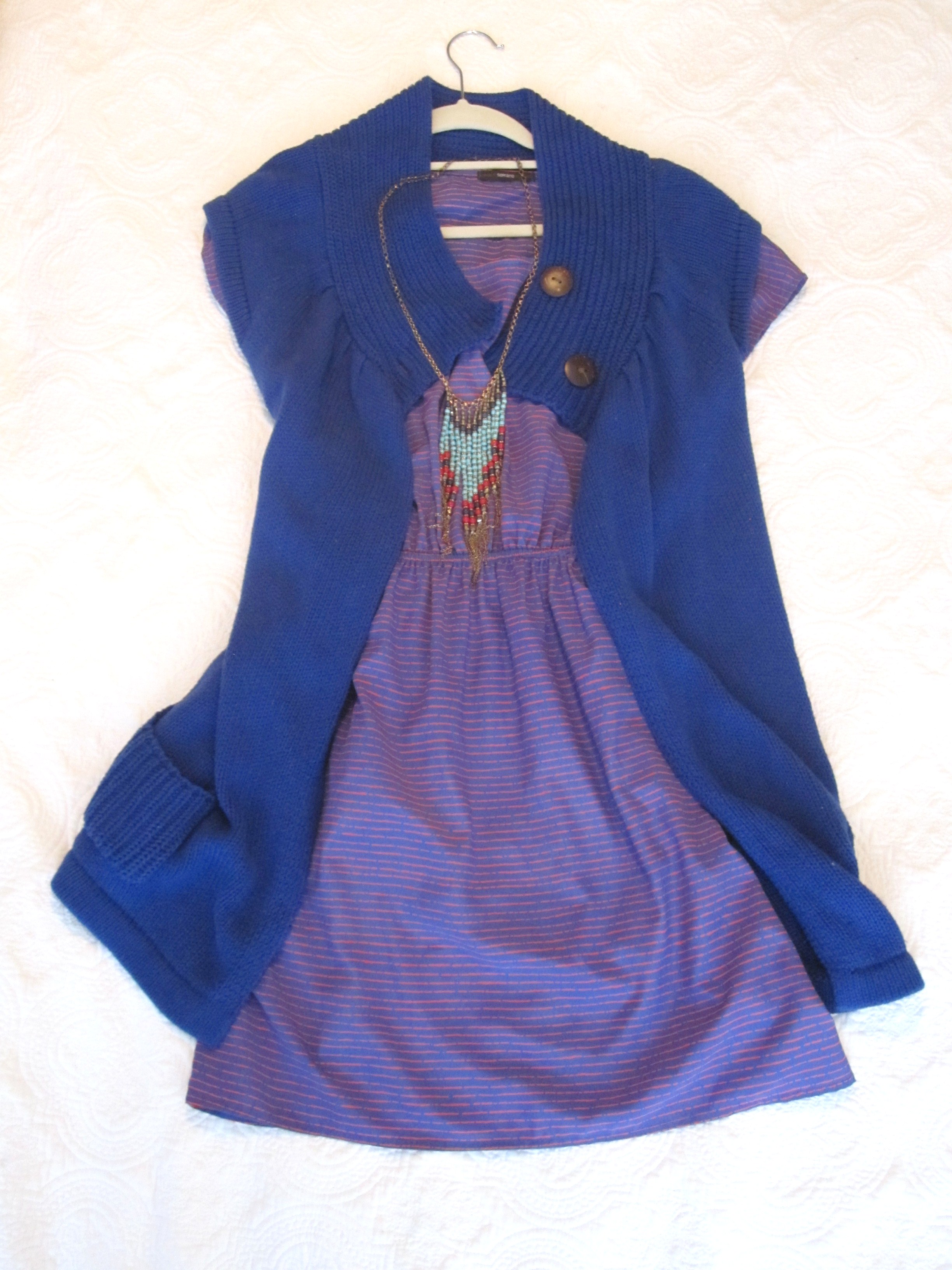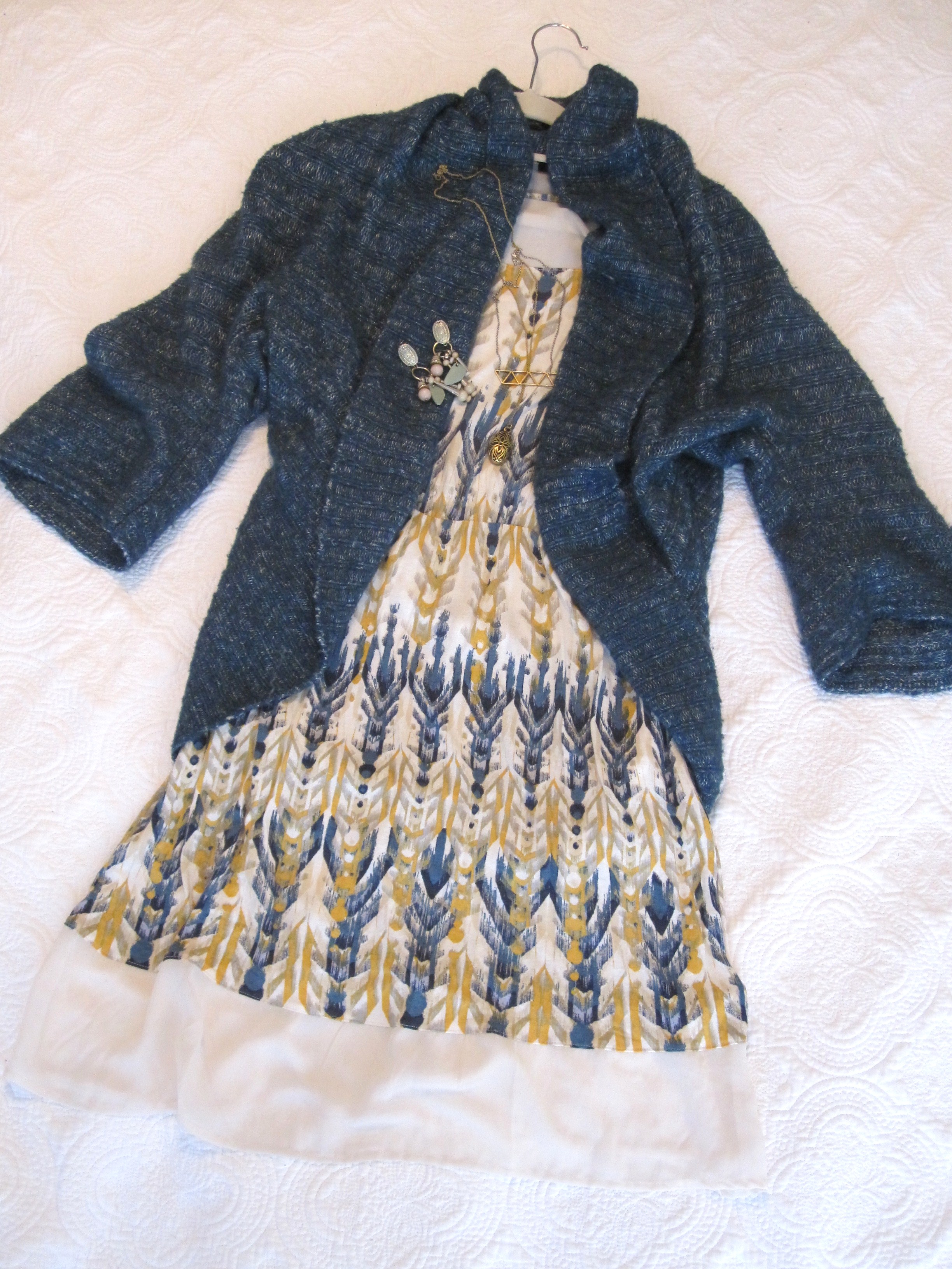 Casual bright blue long sweater with Winners tunic and vintage jewelry. Good for a Friday where I’ll be on my feet and needing to move around.