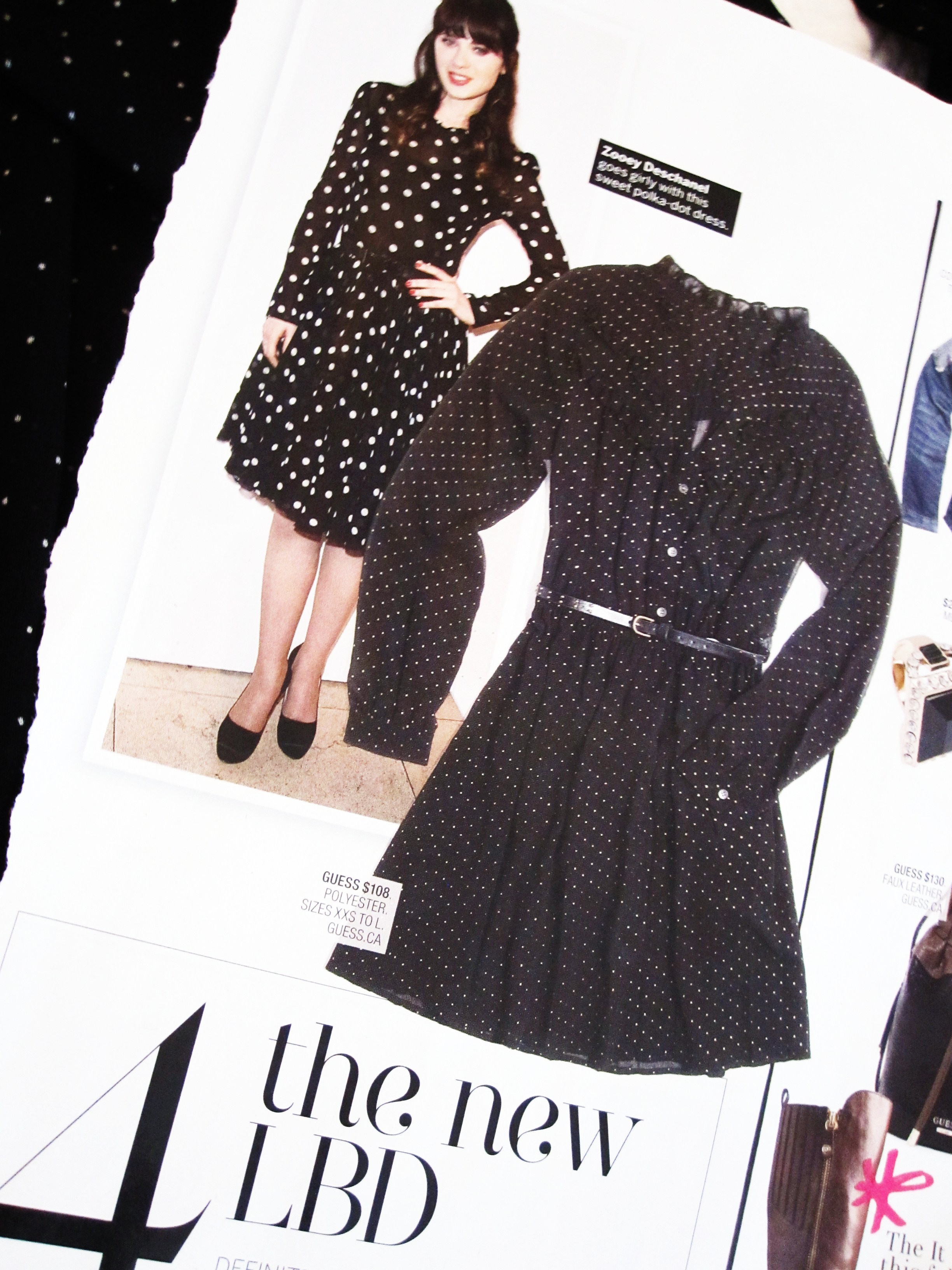 The other day my co-worker turned to me and said, “I want your closet.” This is sweet and flattering, but loving your clothes is not so far out of reach. Admittedly, dating and marrying a woman with an extensive collection of her own has expanded my wardrobe options, but I’ve always loved clothes and collected them lovingly. So, on this beautiful snow day I saw the magazine picture of Zoey Deschanel wearing a sweet polka-dot dress and knew exactly what I had in my closet that would replicate it. Today’s challenge: be my own stylist.