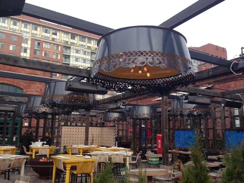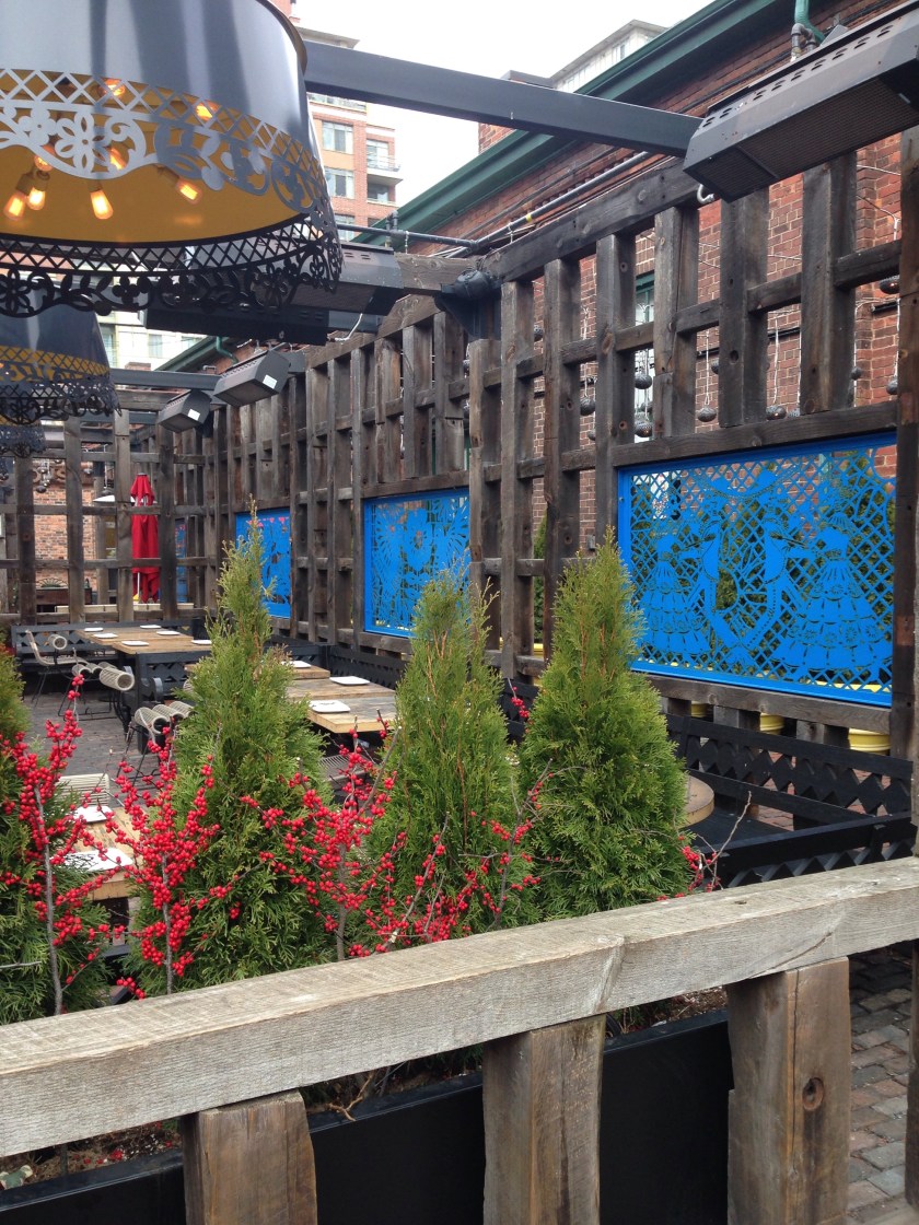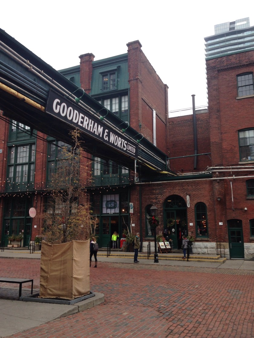 Yesterday we went to the Distillery District to enjoy a stroll and some lunch, and incredibly unseasonal warm weather. The streets were decked out and we, oddly, were sporting our holiday colours.