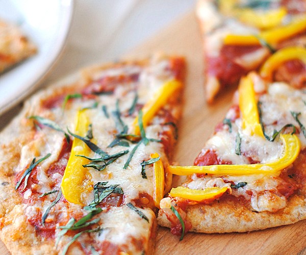 Mini pizza party: apple slices, green pepper, marinated tempeh and pizza topped with olives, spinach and artichoke hearts.