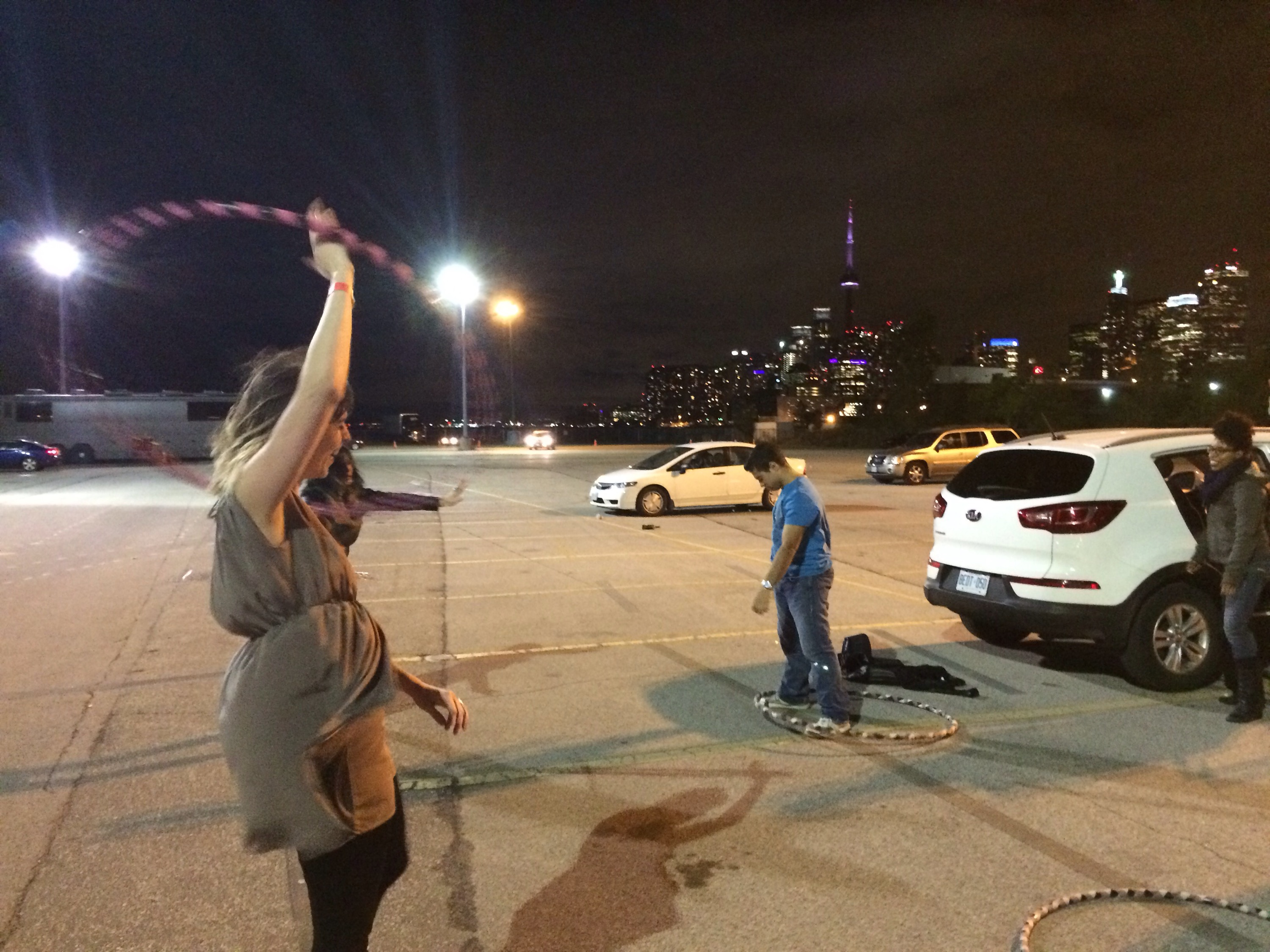 Five girls, a bunch of hoops, a crowd pumped up and primed from the concert, the Toronto skyline in the back ground: this caused a flurry of cell phone videos, none of which I could easily locate, and other people began getting out of their cars to ask if they could join.