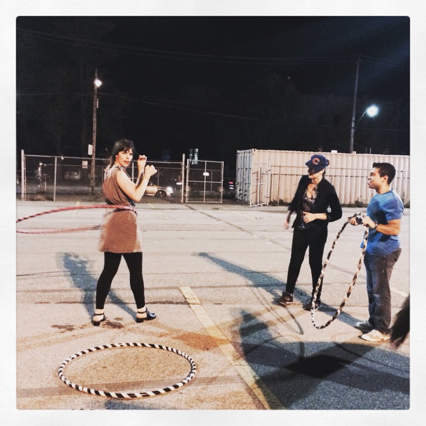 After the show there was a crush of people, waiting for taxis and trying to funnel (unsuccessfully) out of the single lane exit of the only venue parking lot. After about 5 minutes of moving NOT AT ALL we opted to turn the car off, except for the stereo, and got out to hula hoop. I just happened to have 12 hula hoops in the car because I had brought them in to do a fun physical warmup with my class this morning.
