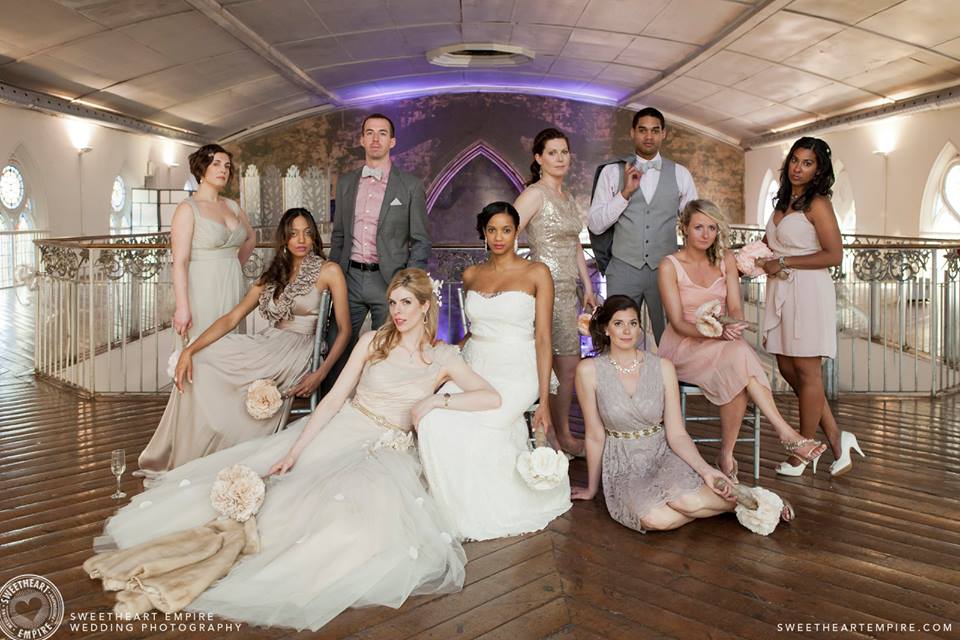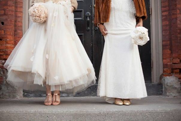 We decided to forgo the awkwardly posed shots and, instead, to go SUPER posed, for a Vanity Fair/Netflix inspired editorial look. All of our bridal party members got to choose their own attire, from a palette of colours for a vintage, soft look, with a cohesive, romantic tone. We wore two of my grandma’s vintage furs, and all of the bridesmaids were able to re-wear their dresses. Given that there was no ‘groom,’ we had no ‘groomsmen,’ but each of us had our brother step in as our ‘best man.’