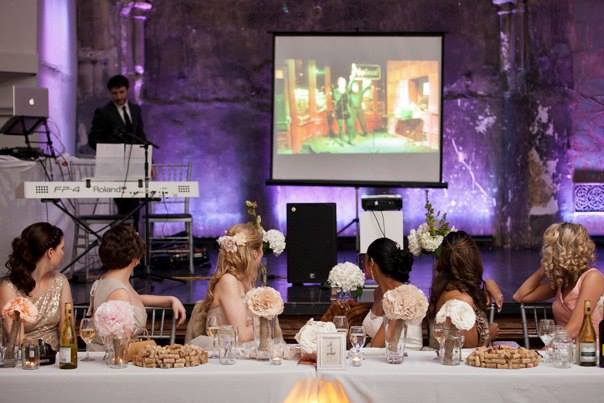 There was a surprise during dinner: amidst the childhood photos and slideshow – a video of our proposal. An onstage karaoke request for her hand in marriage. We had wine cork wreaths and all of our bridesmaids carried handmade paper bouquets by a local artisan.