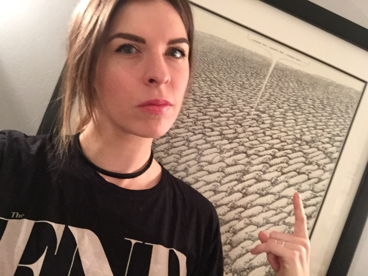 The End. I dressed for a day of mourning, and (ironically?) posed in front of an image of sheep plummeting off a cliff en masse – one lone sheep is going against the herd, bleating ‘excusez moi…’. And the day only got worse from there.