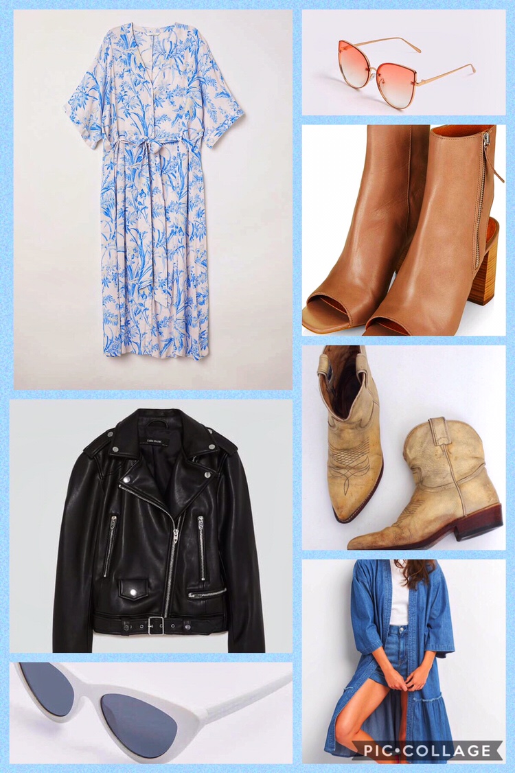 Aldo sunglasses, Zara moto jacket, Gap denim trench, Frye cowboy boots, Topshop leather peep toe boot and H&M dress.