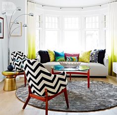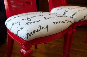 We addressed our kitchen table chairs ourselves: mismatched bold prints for the seat cushions. Easy to do ourselves and big bang for your buck. I was able to get the squares of fabric at Designer Fabrics in downtown Toronto for a great price. Just a little over half a meter, cut in half = two chairs, done.